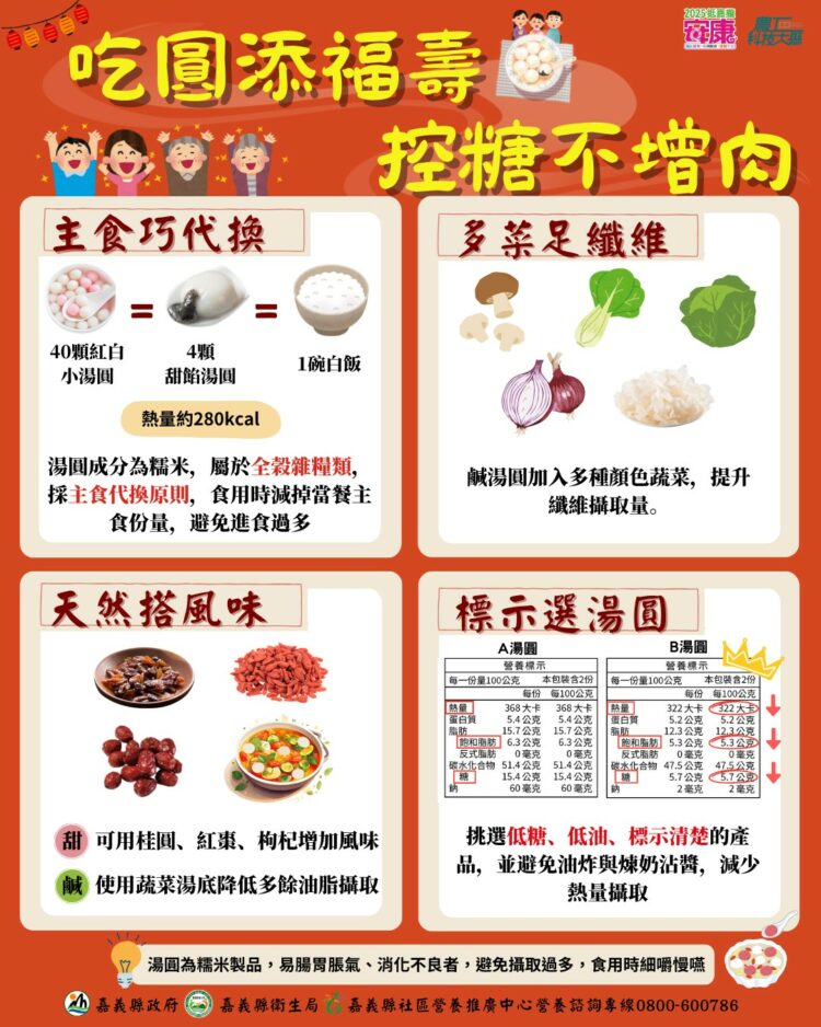 嘉義縣社區營養推廣中心推出「吃圓添福壽 控糖不增肉」健康吃湯圓四招,一、湯圓替換主食適量進食,二、加入蔬菜提升纖維,三、選擇天然食材搭風味減少糖油攝取,四、看懂標示聰明挑選產品。讓大家在溫馨的節氣中,也能吃得健康又安心。