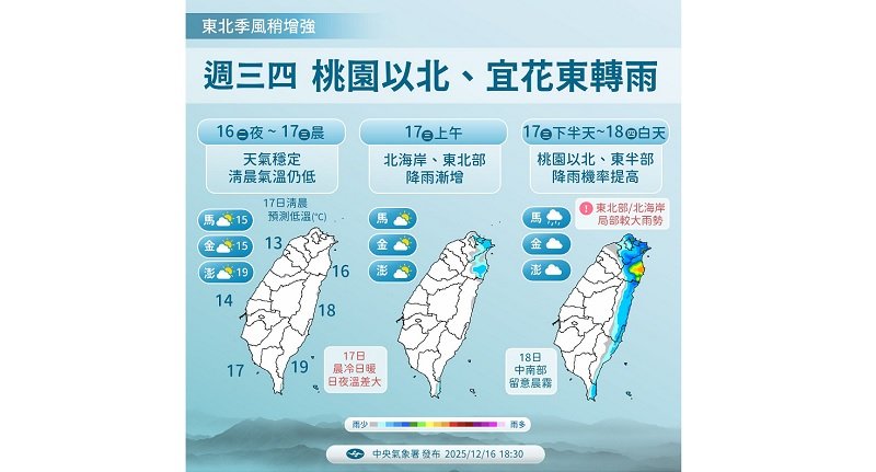 週四(18日)東北季風影響,桃園以北及東北部天氣較涼,其他地區早晚亦較涼,新竹以南日夜溫差大;基隆北海岸、東北部地區及大台北山區有短暫雨,並有局部較大雨勢發生的機率,東部、東南部地區及恆春半島有局部短暫雨,桃園以北地區有零星短暫雨,其他地區為多雲到晴。