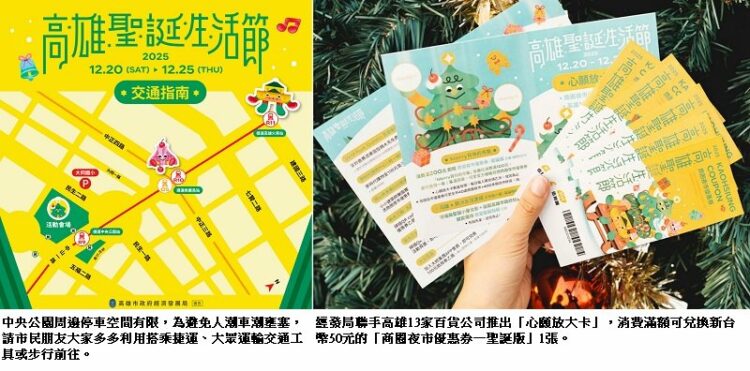 高雄聖誕生活節「聖誕黃金週」將在周末精彩登場!「Golden公園大舞台」集結落日飛車Sunset Rollercoaster、滅火器Fire EX等25組超豪華陣容,12月20日至24日連唱五天,同時還有「Merry買你的市集」集結各大商圈、市集名攤及原民料理等,超過150攤精彩饗宴,經發局更聯手高雄13家百貨公司推出「心願放大卡」,憑卡在「Merry買你的市集」消費滿100元即獲得1章,集滿2章可兌換面額新台幣50元的「商圈夜市優惠券-聖誕版」1張,多重饗宴陪伴度過浪漫的聖誕節。