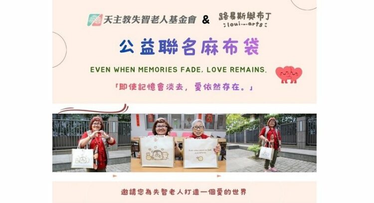 為確保失智長者能持續獲得專業、安全且有尊嚴的照護,及順利推動全國教育宣導工作,天主教失智老人基金會亟需大眾以定期定額或小額捐款的方式加入支持行列。該會首次攜手知名插畫家《路易斯與布丁》,推出限量聯名公益麻布袋。溫暖的插畫風格,以「陪伴」為核心概念,傳遞對失智者與照顧者的支持。圖中的角色們溫柔地扶著長者,象徵在記憶逐漸淡去的過程中,家人與照顧者仍願意一起走過這段旅程。作者在麻布袋設計上有一段文字 “Even when memories fade, love remains.”代表:「即使記憶會淡去,愛依然存在。」呼籲社會看見照顧者無聲背後的辛苦付出,以及始終存在的溫柔,也期望能為每位照顧者與失智者帶來力量與安慰。