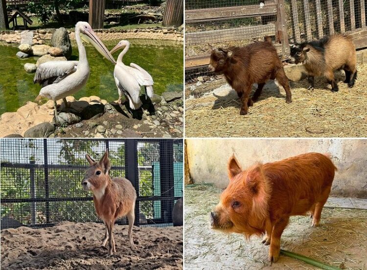 圖/鵜鶘在壽山動物園「友禽天地」生活(左上)、侏儒羊在壽山動物園「兒童牧場」與波爾羊為鄰(右上)、兔豚在壽山動物園的印度大犀鳥展場旁(左下)、在壽山動物園空橋下的羊駝展場旁可看到庫你庫你豬(右下)