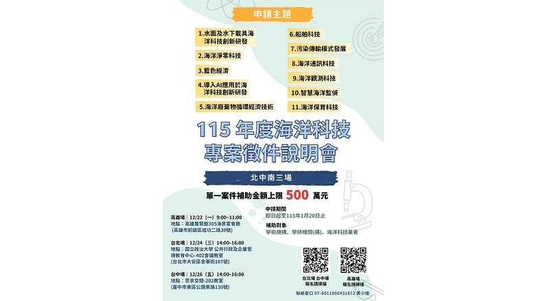 為加速推動我國海洋科技創新能量,強化海洋治理、海洋保育及產業轉型之科技應用,海洋委員會已於11月24日正式啟動「115年度海洋科技專案計畫」徵件作業,這徵件採線上申請方式,受理期間至115年01月20日止。海洋委員會亦將於本(12)月舉辦北、中、南共3場徵件說明會,廣邀全國學術單位、研究機構及海洋科技業者共同投入,以科技為核心動能,擘劃臺灣海洋永續發展的新藍圖。