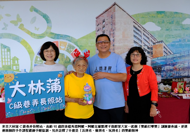 今日活動現場氣氛熱烈,長輩們為了這次的發表會卯足全力。來自小港區港興里的「樂齡舞動」展現了不輸年輕人的舞步;而全場最吸睛的「嬌點」,莫過於來自大林蒲 C 級巷弄長照站、高齡 92 歲的黃楊秀霞阿嬤。她頭戴俏皮的聖誕麋鹿髮箍,驕傲地展示自己親手製作的工藝品,阿嬤在據點裡不僅跟著大家一起做「樂齡打擊樂」訓練節奏感,更透過精細的手作課程鍛鍊手眼協調,完美詮釋了什麼是「活到老、動到老、玩到老」的樂齡精神。