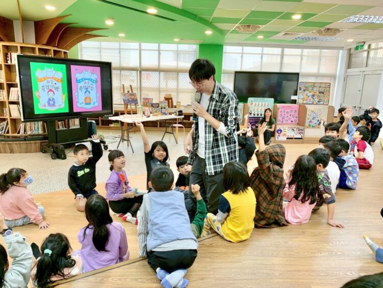 在圖書館主場演出的是人稱鬼才繪本作家-信子,為孩子帶來創作分享會,信子透過《虎菇鍋》《我愛奇怪阿公》《我愛奇怪阿嬤》《貓熊警察》等繪本創作故事的私房分享,及滿場的繪本遊戲特展,帶孩子一起走進他的奇思妙想世界裡,一起發掘各種奇怪點子,把日常小事變成創作靈感。