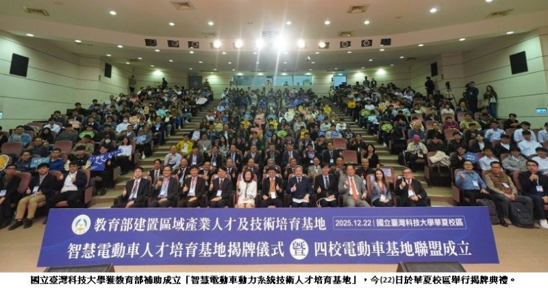 為推動智慧電動車技術研發與高階人才培育,國立臺灣科技大學獲教育部補助成立「智慧電動車動力系統技術人才培育基地」,今(22)日於華夏校區舉行揭牌典禮。經濟部部長龔明鑫、技職司司長楊玉惠及多位產官學代表皆到場共同見證,展現臺灣在智慧電動車領域邁向嶄新階段。臺科大將透過完整的學程規劃與產學合作機制,強化跨領域研發與技術整合,聚焦電動車動力系統和智慧車輛領域,拓展多元應用面向,致力提升產業競爭力並改善人才缺口。