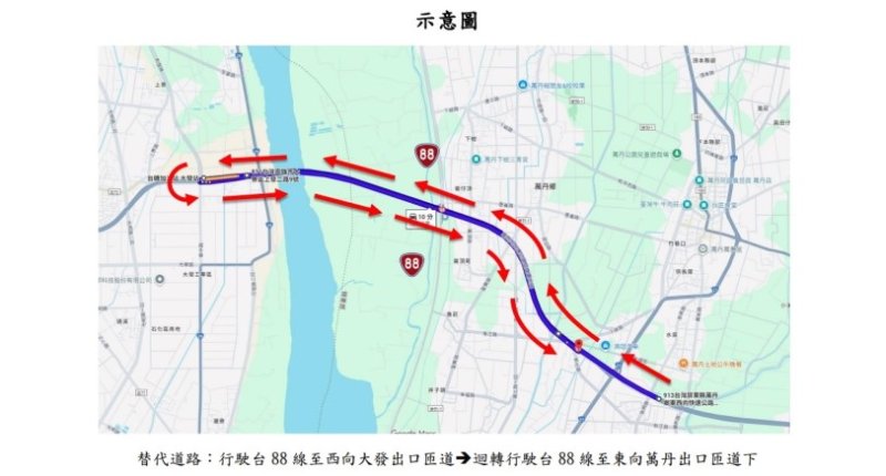 改道路線:行駛台88線至西向大發出口匝道下→ 迴轉行駛台88線至東向萬丹出口匝道下(如示意圖)。