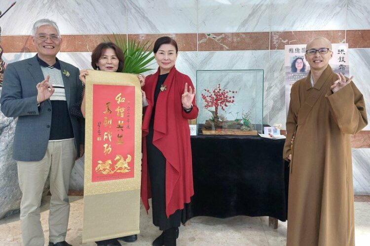 南華大學終身學習學院樂齡大學學員洪銀霜嘉義市議會一樓文化走廊展出「纏花練禪心—洪銀霜纏花作品展」,於11月4日正式拉開序幕,展出至12月23日,共展出近40件精緻纏花作品。為表達對洪銀霜學員的肯定與祝福,南華大學校長高俊雄與副校長賴淑玲,以及承辦樂齡大學的終身學習學院院長知賢法師特別撥冗於12月18日前往嘉義市議會展場參觀展覽,並致贈南華大學創辦人星雲大師2026馬年一筆字春聯墨寶,為其祝福展覽「馬到成功」。除了學校師長蒞臨參觀,該校樂齡大學的學員們也到場相挺、支持觀展,並聆聽介紹,深入了解每幅作品背後的小故事和創作靈感。