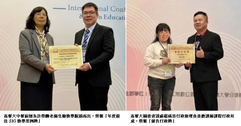 在完善的行政支援體系下,高餐大於本屆論壇中展現亮眼成果「年度最佳 SIG 教學案例獎」,由中餐廚藝系許榮麟老師規劃的「綠色環保廚房」課程,成功將永續理念融入數位教學設計。透過高品質影音內容與專業課程架構,展現高餐大將「實作導向學科」轉化為「線上精品課程」的成熟實力,深獲評審肯定。圖書資訊處楊咸音行政助理長期負責磨課師課程行政推動及教育部補助計畫執行,積極媒合教師投入課程製作,並於行政協調與制度運作上表現卓越,成為推動數位課程發展的重要推手,榮獲「優良行政獎」肯定,對行政人員來說為一大鼓舞。