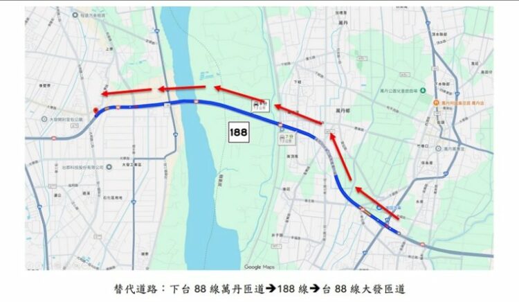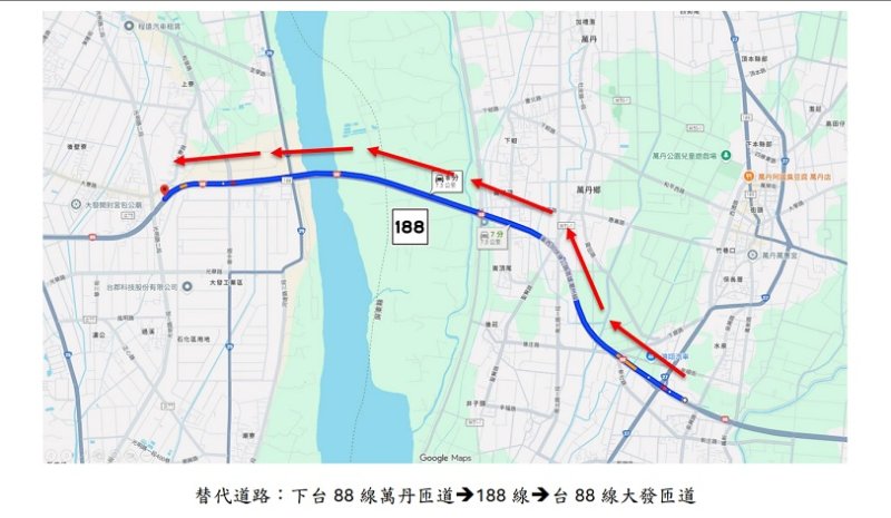交維措施:引導下萬丹出口匝道,沿188線由大發匝道續行台88線至高雄。