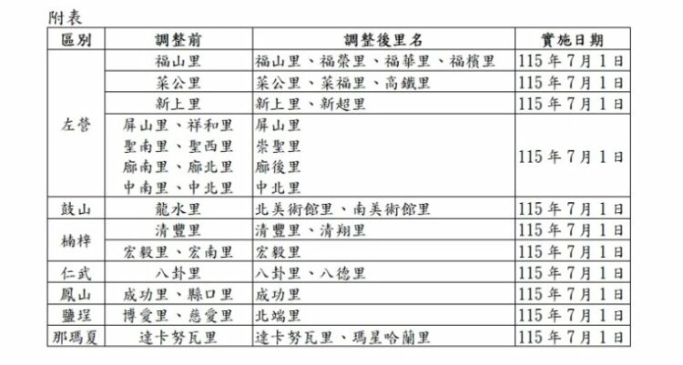 高雄市推動里鄰編組調整,經充分與地方溝通及行政審議程序後,計有左營、楠梓、鼓山、仁武、鳳山、鹽埕及那瑪夏區等7區21里之里調整方案經市府核定,合計新增10里、裁併7里,預計自115年7月1日生效。