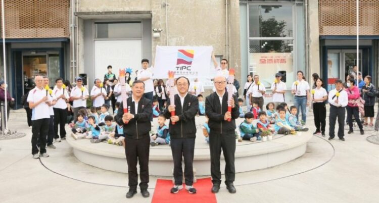 圖/周董事長帶領王錦榮總經理及高雄分公司王派峰總經理一同點燃代表港務精神的火炬,將象徵生命力與傳承的「希望之樹」傳遞給公司教保中心小朋友