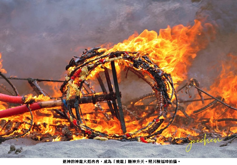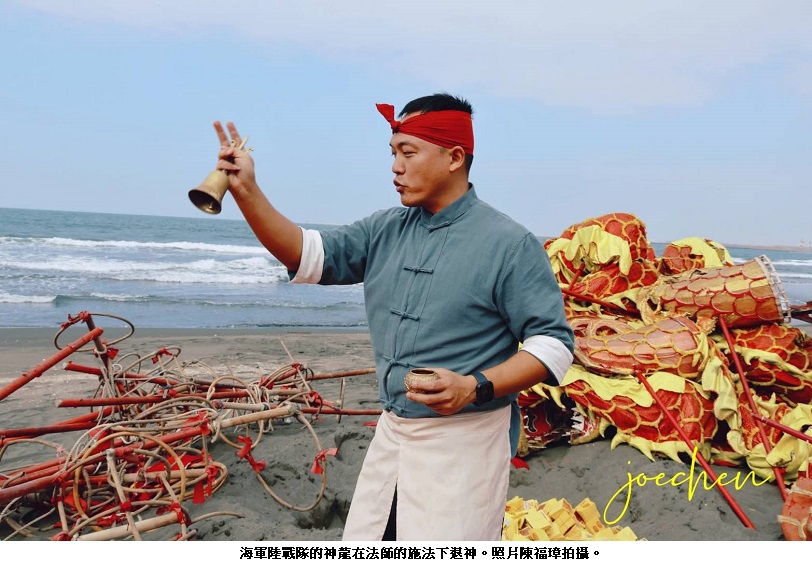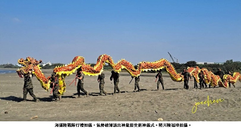 儀式進行到接近尾聲時,海灘上突然傳來一陣雄壯威武的叫喊聲,三尾平時常見於舞龍舞獅場面的「神龍」,在軍人的撐掌下,一字排開沿著海邊「遠遠而來」。