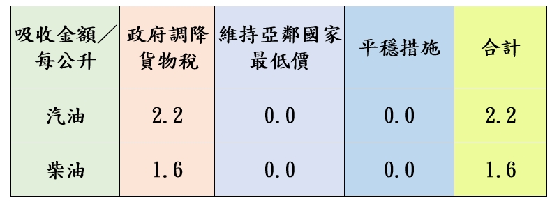 本週依油價公式及政府調降貨物稅(汽、柴油每公升各共2元及1.5元)調整國內油價,並持續以亞鄰國家最低價及平穩措施運作,協助穩定國內油價,114年累計至11月底止,台灣中油共吸收約64.44億元。調價後各式油品實際零售價格以各營業點公告為準。(亞鄰油價資訊請參考全球資訊網https://www.cpc.com.tw產品與服務–產品價格與資訊–亞鄰各國比較表)