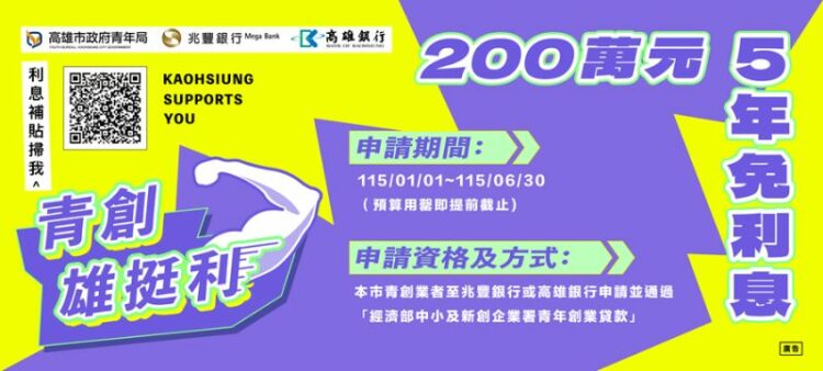 除利息補貼外,青年局亦同步推動參展補助、提供不同規模事業體申請的「一般型」與「競爭型」創業補助,並規劃行銷、法務、財務等主題的免費培訓課程,逐步建構完善的青創支持體系。有資金需求或創業疑問的青年朋友,搜尋「高雄市政府青年局」官網,或追蹤FB、IG與LINE@(@youth.kcg),即時掌握最新青創資源資訊。
