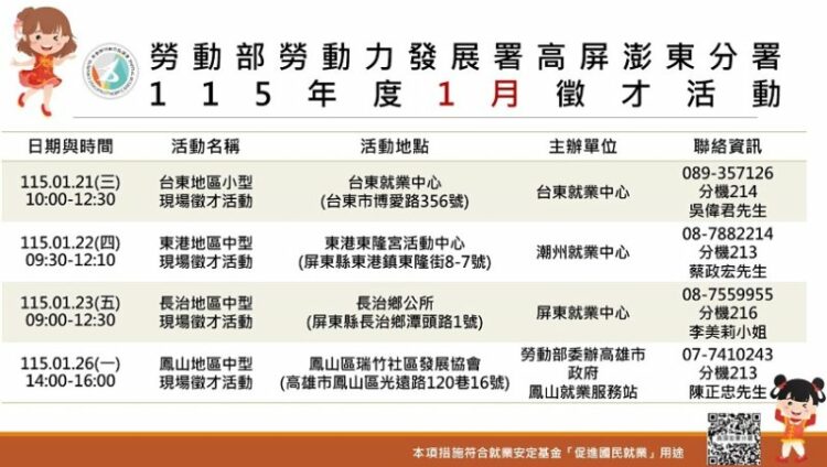 勞動部勞動力發展署高屏澎東分署(簡稱高分署)將於115年1月辦理4場現場徵才活動,邀集逾55家廠商,提供超過1,000個職缺,包含科技製造、餐飲門市、行政服務等多元產業,協助求職者順利就業。歡迎有意求職、待業中與想轉職的朋友踴躍參與!