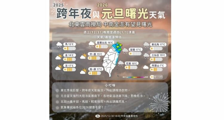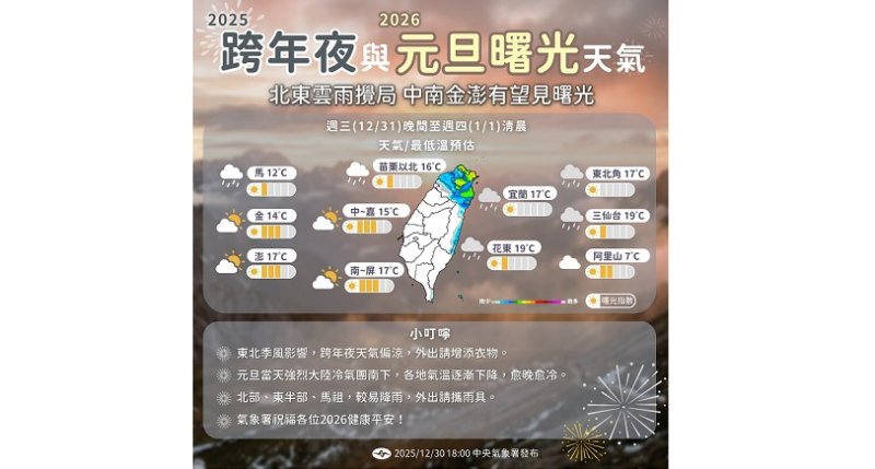 跨年夜吹北北東風,北部及東半部雲量偏多,並有局部短暫雨,尤其基隆北海岸及大臺北山區仍有局部大雨可能,參與戶外活動建議攜帶雨具;中南部則為多雲到晴。各地夜間氣溫偏低,外出跨年須注意保暖。