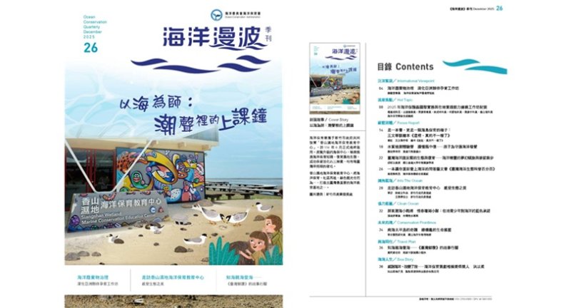 海洋委員會海洋保育署第26期《海洋漫波》季刊於今(31)日正式出刊,本期以「以海為師:潮聲裡的上課鐘」為主題,從國際減塑合作、海洋保護區治理到多元海洋教育實踐,呈現臺灣推動海洋保育的行動力與深耕成果。全刊共收錄11篇報導,延伸探討海洋保育、教育、社區參與與永續發展等多項議題,展現全民共同守護海洋的可能。