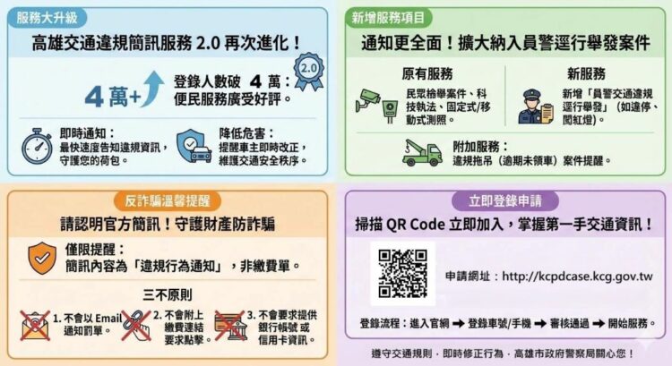 【記者尹遵/高雄報導】高雄市政府警察局自108年1月1日起開放民眾登錄「交通違規簡訊服務系統」,截至今年11月,已有40,253人登錄,發送簡訊21,548則。為提升服務效能,系統再度升級優化,新增「員警交通違規逕行舉發案件」通知功能。