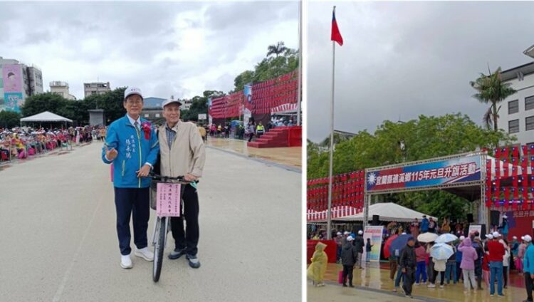 圖/鄉長與抽中單車民眾合影(左)、民眾踴躍參加元旦升旗活動(右)