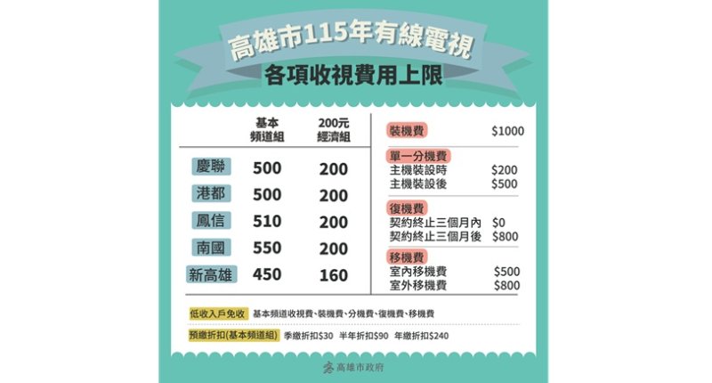 高市府表示,高雄市115年5家有線電視業者每月基本頻道組收視費用上限介於新臺幣450元至550元,裝機費1,000元,復機費800元,室內移機費500元、室外移機費800元,單一分機費在主機裝設時200元、主機裝設後500元;而高市府社會局登記有案之低收入戶享有免收收視費等各項費用之優惠。