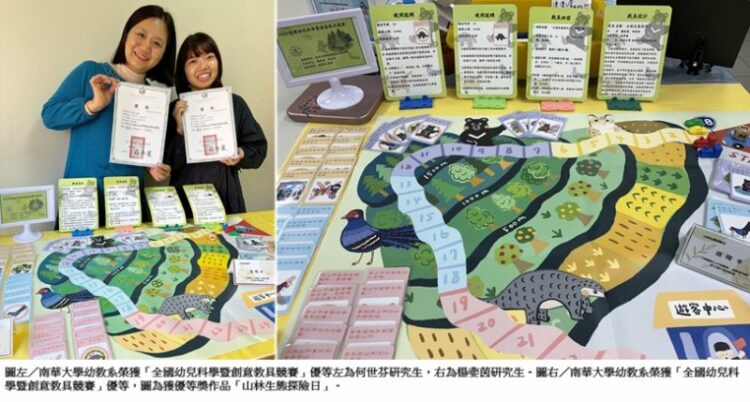 南華大學幼兒教育學系在教學與實務並重的理念下,持續引導學生將創意轉化為具教育意義的學習媒材。日前,該系大學部學生洪逸珊、吳冠潔、蔡昀靜,攜手研究生何世芬、楊斐茵分別組隊,在沈翠蓮教授指導下,參加中華民國學前教育發展學會「2025全國幼兒科學暨創意教具競賽」,以「小小海洋工程師」與「山林生態探險日」兩項教具作品,歷經教具教案設計初賽及實體教具決賽兩階段評選,從全國眾多優秀作品中脫穎而出,雙雙榮獲全國決賽優等佳績,展現南華大學幼教專業與創新能量。