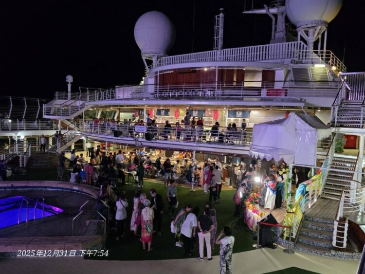 船上在12層夾板舉辦了迎接第一道曙光活動,船笛長鳴慶祝。到了晚上又回到UTC-10時區,因此,慶祝跨年時,是2025年12月31日24:00變成全球最晚的跨年晚會。