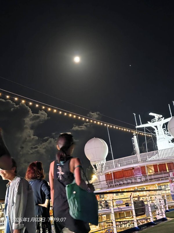 不過有親友純粹在郵輪上欣賞天文景觀,另外一方是在陸地望著月亮和木星,「海上升明月」,「天涯若比鄰」。不是「共看明月應垂淚」,「一夜鄉心兩處同」。
