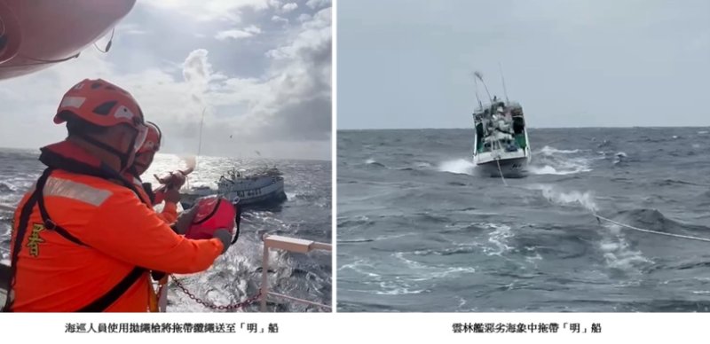 31日20時許,雲林艦抵達「明」船位置,確認船上5名人員均安,然現場海象因東北季風增強、達7至8級陣風10級、浪高約3至4公尺,在此惡劣海象下,漁船失去動力隨時均可能發生意外。為維護我國籍漁船及人員安全,不及等待其他友船前往救援,雲林艦即依標準作業程序展開拖帶救援作業,於惡劣天候狀況下幾經努力,終將怒濤中的救命䌫繩帶上「明」船,日夜守護,緩慢而穩定航返台灣。