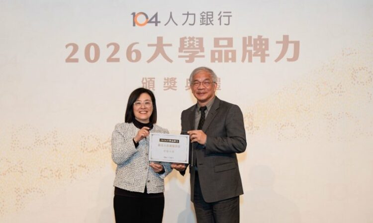 圖:世新大學在2026年《大學品牌力》調查中,連續三年榮獲「大眾傳播學群」全國第一殊榮,104資訊科技總經理黃于純(左)頒獎予校長陳清河(右)