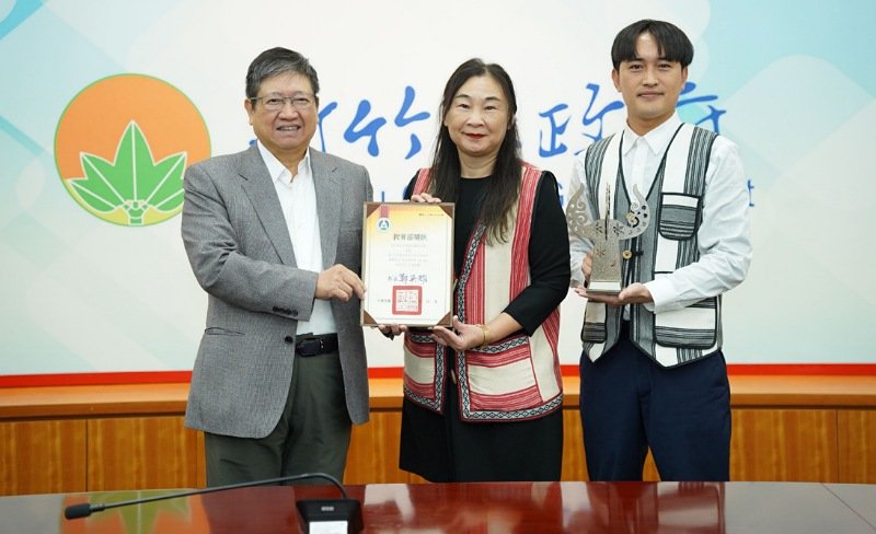 圖:新竹縣尖石鄉新光國民小學校長錢偉慈獻獎給縣長楊文科/竹縣府提供