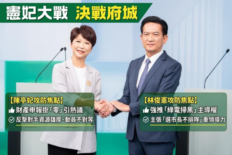 在近期的政見說明會中,雙方針對「競選手段」與「接班理念」展開直接對話。林俊憲主張「選市長不是在排隊」,強調接班應以民意趨勢與城市未來發展為重,而非僅考量資歷深淺,呼籲選民支持具備新世代領導力的候選人。陳亭妃則反擊,指出對手陣營擁有極為雄厚的競選資源,並提及大規模動員支持者的現象,暗示派系與行政資源的介入可能導致競爭基準不對等。