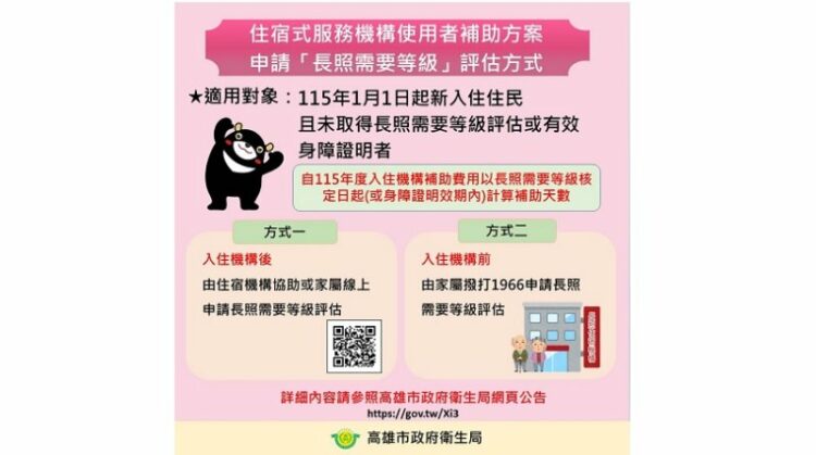 配合中央長照3.0政策,自115年度起住宿式服務機構使用者補助方案補助天數,將以「長照需要等級核定日起」或「身障證明效期內」計算,將不再放寬追溯,高雄市政府衛生局提醒,115年新入住住民務必及早申請至機構長照需要等級評估,如已於114年12月31日前經評估長照需要等級4級以上或具身心障礙證明中度者,免申請長照評估,入住即開始計算補助天數。
