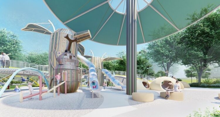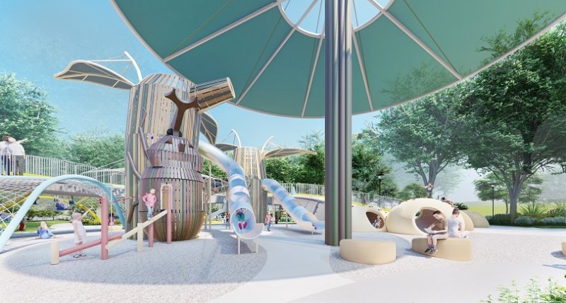 陳局長表示,獨角仙生態公園延續市長盧秀燕推動「區域均衡發展」與「生態復育」的施政方向,由市府團隊打造兼具安全性與多元性的親子遊憩空間,讓山城地區民眾也能享有優質完善的休憩環境。公園以「獨角仙」為主題,結合其生命週期設計,規劃2大遊戲區、共35種遊戲方式,並融入圍龍屋意象與半月彎造型的遊戲通路,讓孩童在安全環境中盡情探索。園區面積達4,400平方公尺,寬敞空間可提供多樣活動,並設有遮陽設施與戲水區,兼具避暑與休憩功能。