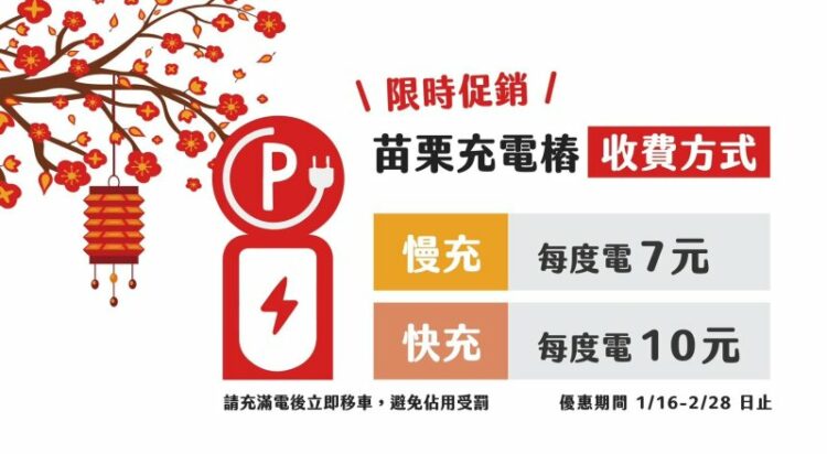 為提升使用率並活絡地方經濟,縣府同步推出「感恩回饋優惠」。自115年1月16日起至115年2月28日止,所有公有充電樁將實施優惠方案,快充每度電調降至10元,慢充每度電7元。縣府期盼透過優惠措施,吸引外縣市電動車車主前來苗栗旅遊,帶動商圈發展與觀光人潮,注入綠色經濟動能。