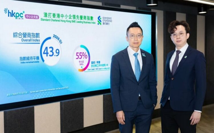 圖/香港生產力促進局首席數碼總監黎少斌先生(左)及渣打大中華區經濟師陳冠霖先生(右)在2026年第一季“渣打香港中小企領先營商指數”新聞簡報會上公佈,本季綜合營商指數為43.9,指數維持平穩。