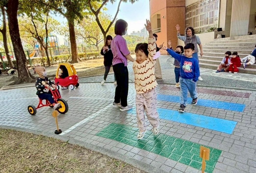 活動中,幼兒實地練習辨識紅綠燈號誌、牽手走斑馬線,模擬日常生活中的過馬路情境,讓交通安全不再只是口頭宣導,而是落實在生活體驗中。孩子們在老師引導下,一步步完成闖關任務,學習成為守規矩、懂安全的小小行人。