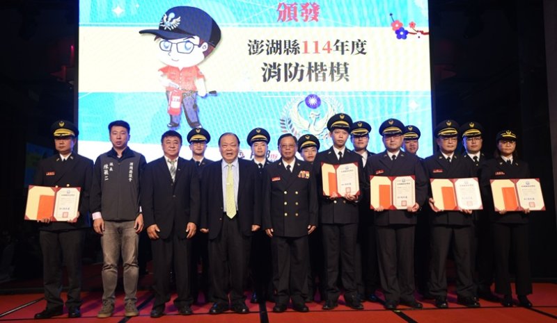 澎湖縣長陳光復16日晚間出席澎湖縣115年度「119消防節慶祝大會」,頒獎表揚鳳凰獎全國消防與義消楷模、全國防火宣導志工、全國救護志工菁英及多位績優消防人員、義消楷模。陳光復感謝消防同仁與義消夥伴無怨無悔的付出,在第一線守護鄉親生命與財產安全,是澎湖最值得信賴的守護力量。