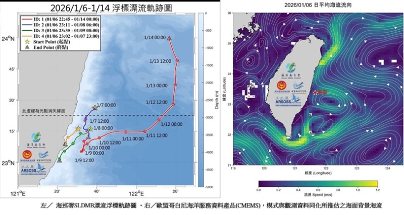 第二,國海院運用1月6日至1月14日的歐盟哥白尼海洋服務資料,製作海面背景海流動畫。此類資料係結合模式與觀測同化所得大尺度背景流場,特別適合用來理解那段時間的黑潮主流軸線位置及周邊渦旋結構的整體變化。國海院也提醒該背景海流不包含潮汐與局部風浪造成的瞬時變動,因此在近岸區域,仍須搭配漂流浮標或海洋雷達等現地觀測資料,才能掌握更細緻的流況。