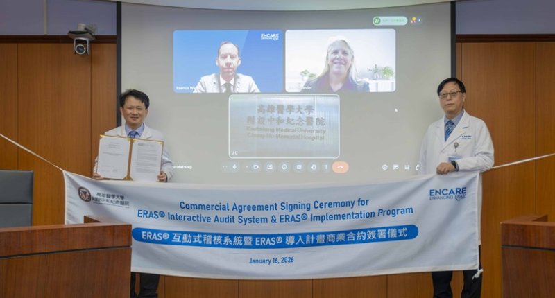 高雄醫學大學附設中和紀念醫院(以下簡稱高醫)自2021年起系統性推動 ERAS 照護方案,迄今已有603例手術病人依此模式完成照護。臨床成效顯示,術後併發症發生率大幅降低約 50%,平均住院天數更縮短約30%,充分展現 ERAS 在提升照護品質與醫療效率上的實質成效。為進一步強化國際實證醫療、標準化圍手術期照護及智慧醫療發展,高醫於昨日(1/16)與瑞典Encare 簽署 ERAS® 互動式稽核系統(ERAS® Interactive Audit System, EIAS)及 ERAS® 導入計畫(ERAS® Implementation Program, EIP)合作,成為南台灣首家與 Encare 簽約的醫療機構,高醫以國際標準精進醫療品質,期望打造世界級ERAS 術後康復照護典範。