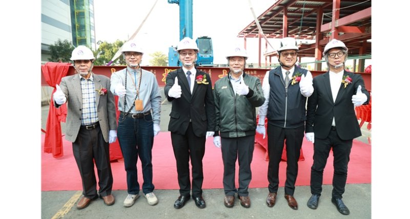 圖/園管局楊志清局長(左3)於上梁儀式和與會貴賓合影留念。左起:喬鋒機電股份有限公司張志鑫董事長、園管局楊伯耕前局長、園管局楊志清局長、中興工程顧問股份有限公司余信遠總經理、永青營造工程股份有限公司曾國進董事長、許銘陽建築師事務所許銘陽建築師