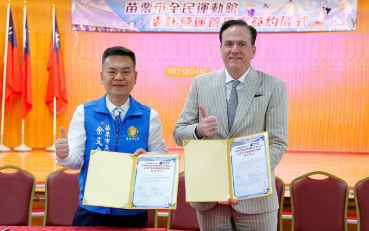 苗栗市公所攜手World Gym世界健身俱樂部,今(21)日辦理「苗栗市全民運動館」委託營運管理簽約典禮,由苗栗市長余文忠與世界健身事業有限公司(World Gym)董事長柯約翰代表正式簽署為期9年的營運契約,透過公私協力模式,推動苗栗市綜合羽球場及健身設施營運,全面強化公共運動服務,擴充市民運動與健康服務內容。