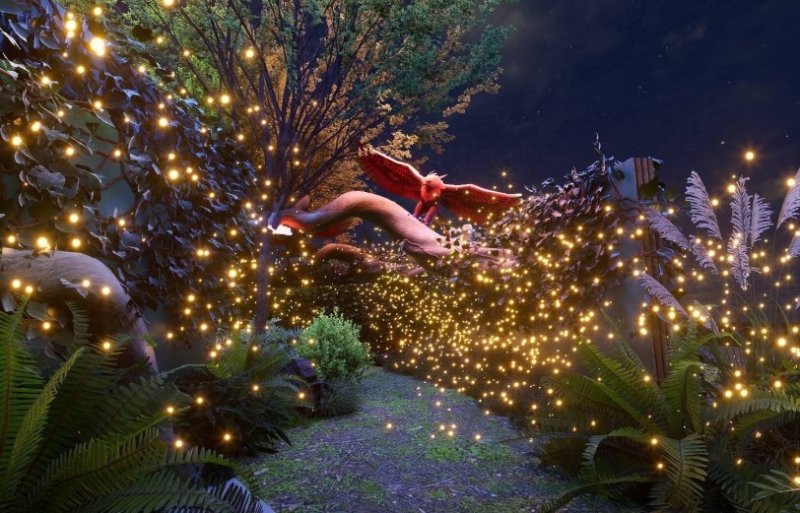 旅程首先將被氣勢磅礴的「馬首引領」震撼,踏入神秘的綠光之森,燈影在林間流動,彷彿瞬間穿越至遠古雨林;耳畔傳來鳥鳴、獸吼與風聲交織,春雷乍響,大地甦醒,萬物在黑夜中悄然復活。沉浸之際,偶然發現林深之處竟藏著一艘遺世獨立的擱淺船骸—「綠舟棲地」,引人無限想像。