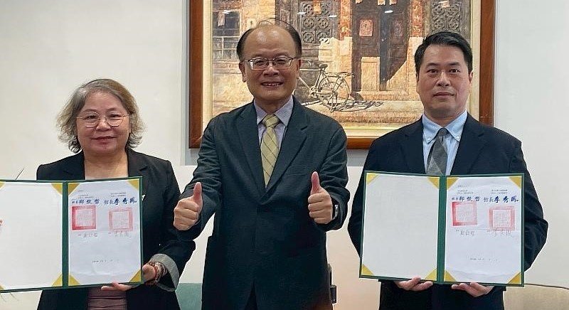 圖/高雄科工館李秀鳳館長(左)與中信科大鄭欽哲校長(右)在終身教育司司長梁學政(中)見證下簽署合作備忘錄。(圖/中信科大提供)