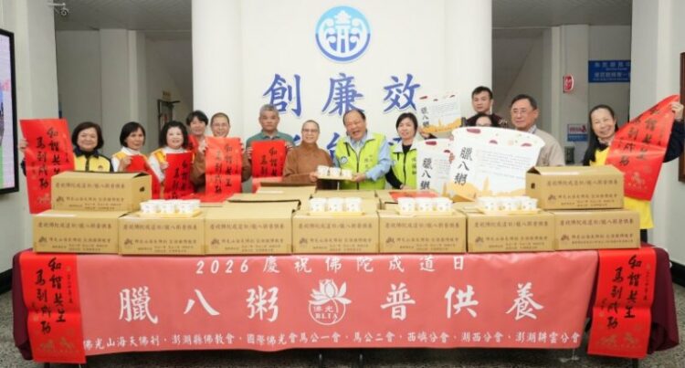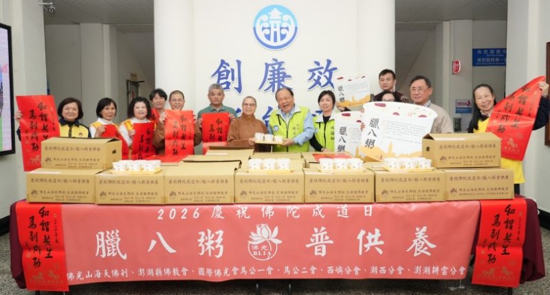 為紀念佛陀成道日,佛光山海天佛剎今(23)日特別準備680碗熱騰騰的臘八粥,並致贈星雲大師新春賀詞「和諧共生 馬到成功」,與縣府同仁結緣,在寒冬中傳遞滿滿關懷與祝福。澎湖縣長陳光復代表縣府表達誠摯感謝,肯定海天佛剎長年深耕地方、關懷社會,為澎湖注入溫暖正向力量。