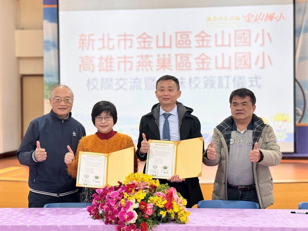 隨後,在張瑞松退休校長的見證下,由高雄市金山國小校長邱世杰與新北市金山國小校長楊智先共同簽署姊妹校合作協議書,象徵雙方建立長期合作與交流關係,成為全台唯二的「雙金」姊妹校。