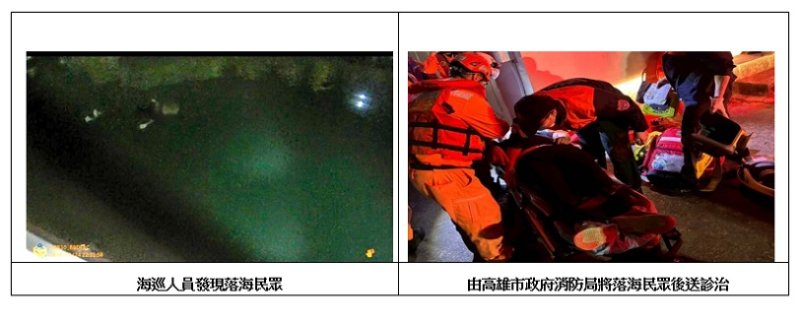 海巡署南部分署第一一岸巡隊指出,當日晚間約10時30分,蚵子寮安檢所人員於巡查期間,發現蚵子寮漁港南堤停車場方向傳出微弱呼救聲,隨即派員前往查看,同步通報海巡署第六巡防區指揮部統合救援能量,啟動緊急救援機制。