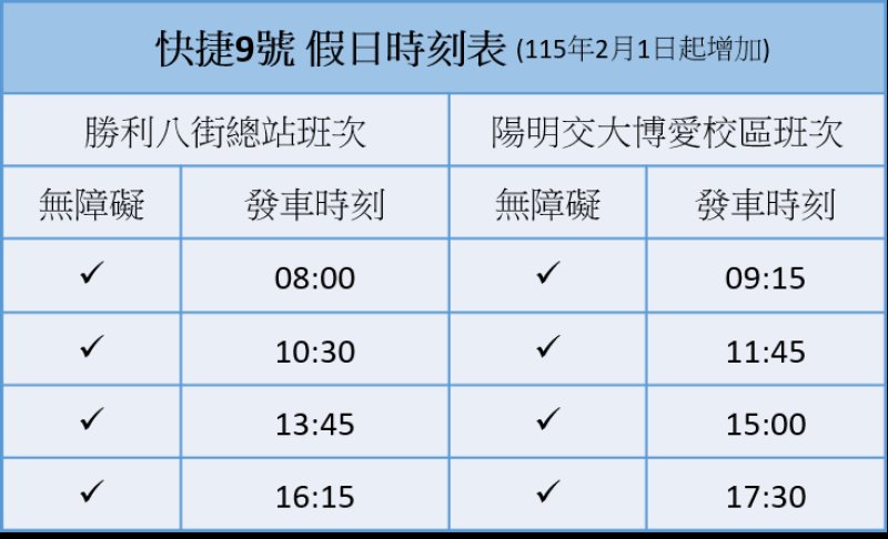 為增進大新竹生活圈往返便利性,快捷9號自115年2月1日起新增假日班表,共8班次,分別為往程(勝利八街總站發車)4班次:08:00、10:30、13:45、16:15;返程(陽明交大博愛校區發車)4班次:09:15、11:45、15:00、17:30。增班照顧假日觀光遊憩、親子出遊及學生往返新竹市區補習之需求,增進高鐵新竹站與新竹火車站之轉乘功能,以利各使用族群搭乘需求。