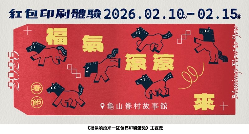 新年將至,龜山眷村故事館於115年2月10日(二)至15日(日)推出春節限定活動《福氣滾滾來—紅包袋印刷體驗》,邀請民眾在新春期間,透過親手印製紅包袋的方式,感受眷村歲時節慶中所蘊含的祝福與人情味。
