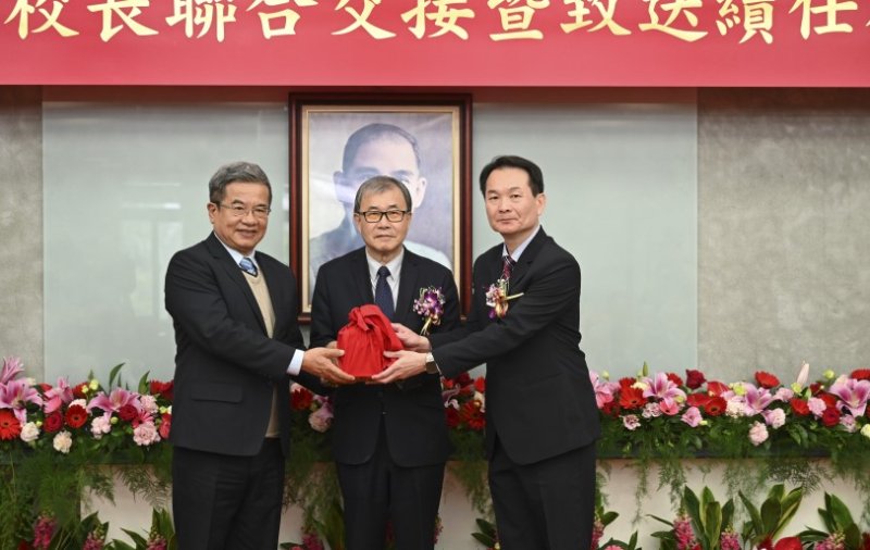 圖/教育部今(28)日舉行國立大學卸新任校長聯合交接典禮,在教育部長鄭英耀(中)見證下,國立高雄科技大學首任校長楊慶煜(左)將印信交給第三任校長吳忠信(右)。
