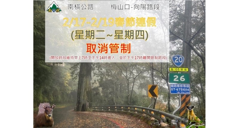公路局南區養護工程分局表示,「台20臨105線0K~44K(南橫公路)梅山口至向陽路段,現為每週星期二、三、四道路管制禁止通行,禁止一般用路人進入」,自實施以來多數民眾都能體諒南橫公路需要適度管制休養生息,讓南橫走得更遠。